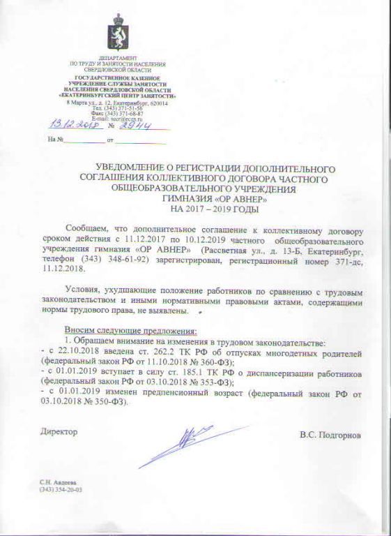 уведомление о регистрации дополнительного соглашенияколлективного договора ЧОУ Гимназии Ор Авнер